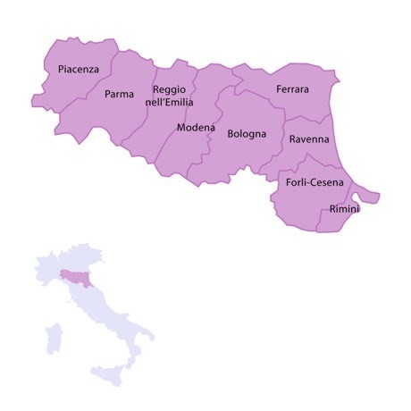 Emilia Romagna (in violet on the map) borders Tuscany in the north of Italy and is known as the bread basket of Italy mainly because of the massive food production around the Po Valley.